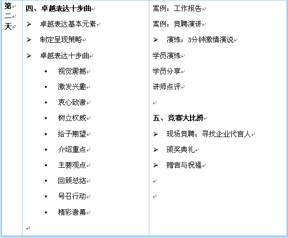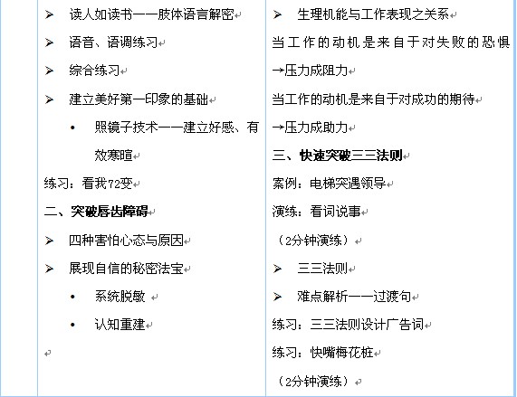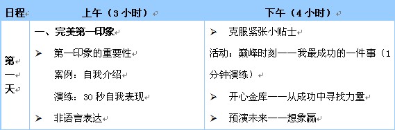 本課程不是簡單的演講與表達課程。這是一套運用體驗式、啟發式教學手段的勵志課程,通過音樂、電影、錄像、案例分析、情景演練等多種互動方式,以達到讓受訓者: