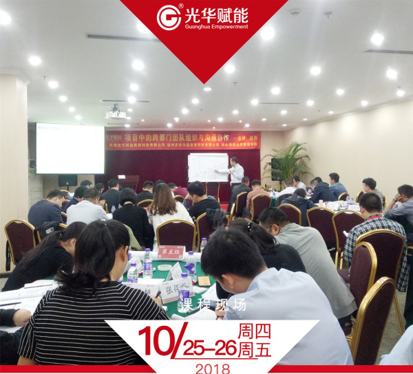 2018年10月25-26日,光華高級講師陳剛老師在浙江梅地亞賓館2樓影視廳獻上互動紛呈的公開課程《項目中的跨部門團隊組織與溝通協作》,早在課程報名伊始,就已經有無數學員躍躍欲試,希望能夠跟隨陳老師的腳步,學到更多有關跨部門溝通的知識。