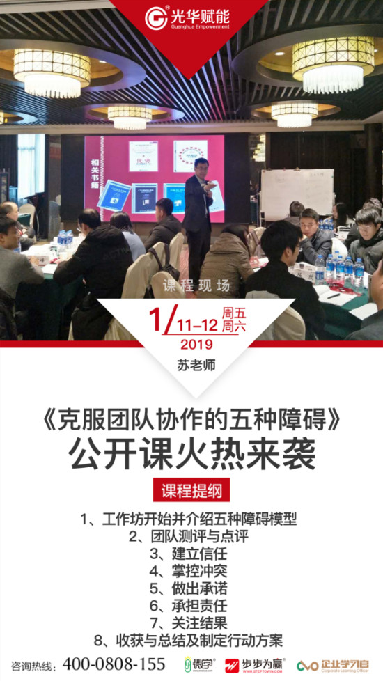 2019年1月11-12日,時代光華高級講師蘇進老師在杭州書香世家酒店三樓滿隴桂廳獻上精彩的光華公開課程《克服團隊協作的五種障礙》,期望通過兩天的高效培訓,讓學員在克服團隊協作的障礙中有新的收獲!