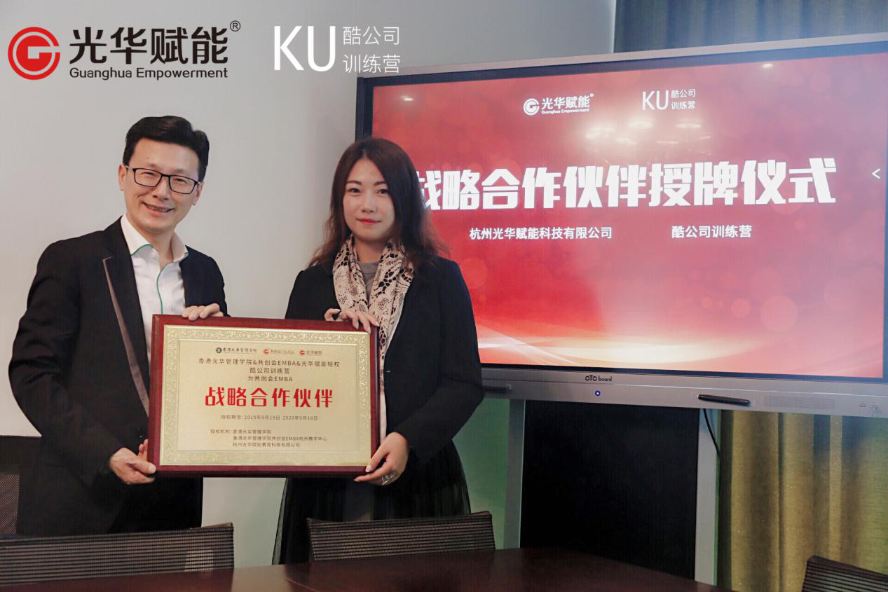 2019年10月16日,杭州光華賦能科技有限公司與酷公司訓練營達成戰略合作意向,并舉行盛大的授牌儀式。雙方將在賦能企業數字化轉型升級方面展開精誠合作,充分發揮各自的影響力和優勢,相互推進發展,推動組織數字化轉型升級,引領行業風潮。