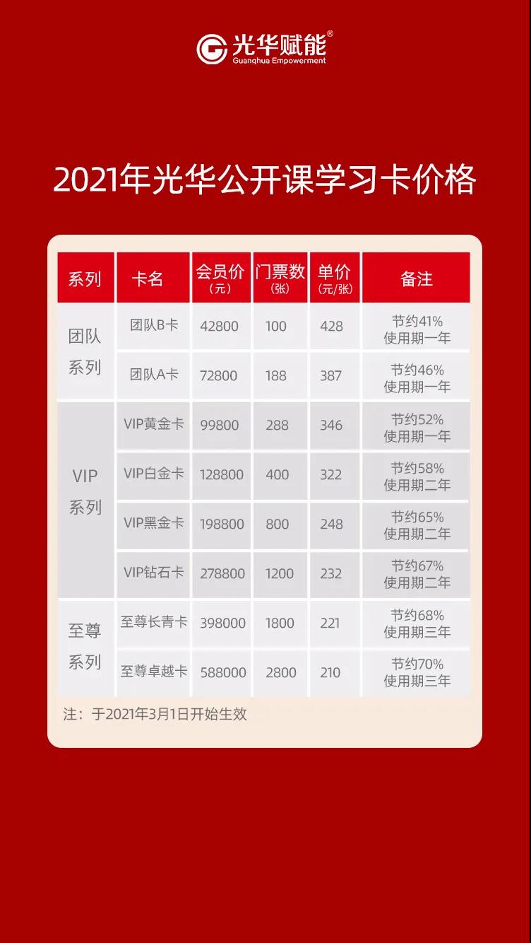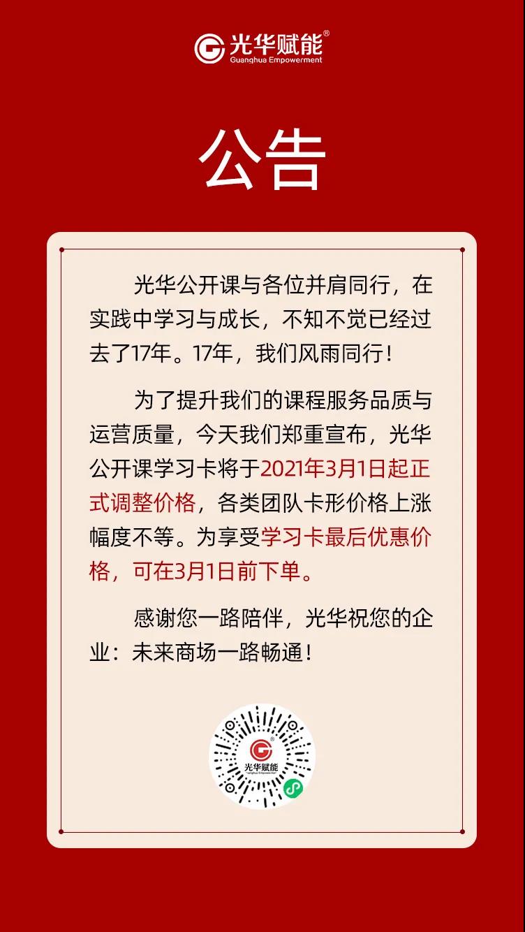 為了提升我們的課程服務品質與運營質量,今天我們鄭重宣布,光華公開課學習卡將于2021年3月1日起正式調整價格,各類團隊卡形價格上漲幅度不等。為享受學習卡最后優惠價格,可在3月1日前下單。