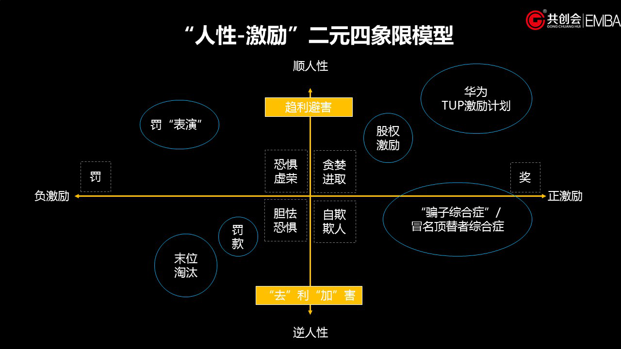 在這個象限中,從根本上說,企業往往是逆著人性中的“趨利避害”,基于“自欺欺人”的人性,采取了正向激勵的方式。