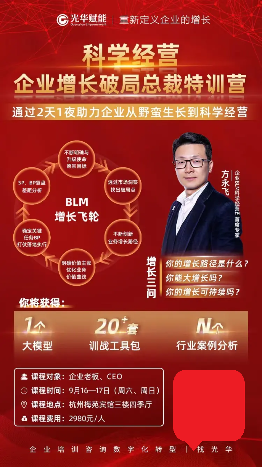 經(jīng)歷過(guò)靈魂拷問(wèn),是不是發(fā)現(xiàn)了自己需要彌補(bǔ)的不足和缺陷,9月份是不是該出來(lái)學(xué)習(xí)學(xué)習(xí)了!參加科學(xué)經(jīng)營(yíng):企業(yè)增長(zhǎng)破局總裁訓(xùn)戰(zhàn)營(yíng),方永飛教授讓您逆勢(shì)而上!