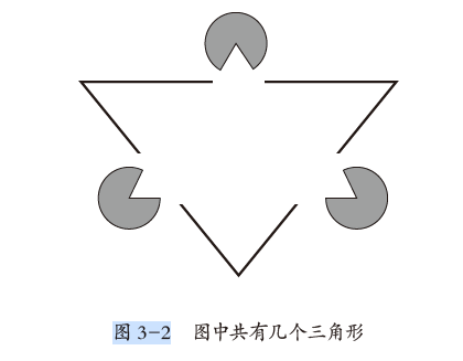 有人提醒我:“方老師,這圖中間有一個(gè)亮晶晶的大三角形,這么大一個(gè)三角形,你怎么沒看見呢?”這個(gè)人說的有沒有道理呢?前面我們已經(jīng)用三角形的定義衡量過了,圖 3-2 中根本不存在三角形。那他為什么會(huì)這么想呢?其實(shí)是他的眼睛欺騙了他的大腦。